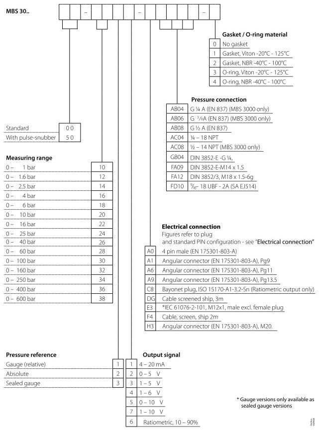Pressure Transmitter DANFOSS MBS 3000/3050 คือเพรสเชอร์ทรานสมิตเตอร์แบบคอมแพคสำหรับงานอุตสาหกรรมและงานไฮดรอลิก (Hydraulic) ให้การวัดความดันที่เชื่อถือได้ในสภาพแวดล้อมรุนแรง รองรับช่วงแรงดันได้สูงสุด 0–600 bar และรองรับเอาต์พุตมาตรฐานหลากหลาย เช่น 4–20 mA, 0–10 V, รวมถึงแบบ ratiometric 10–90%